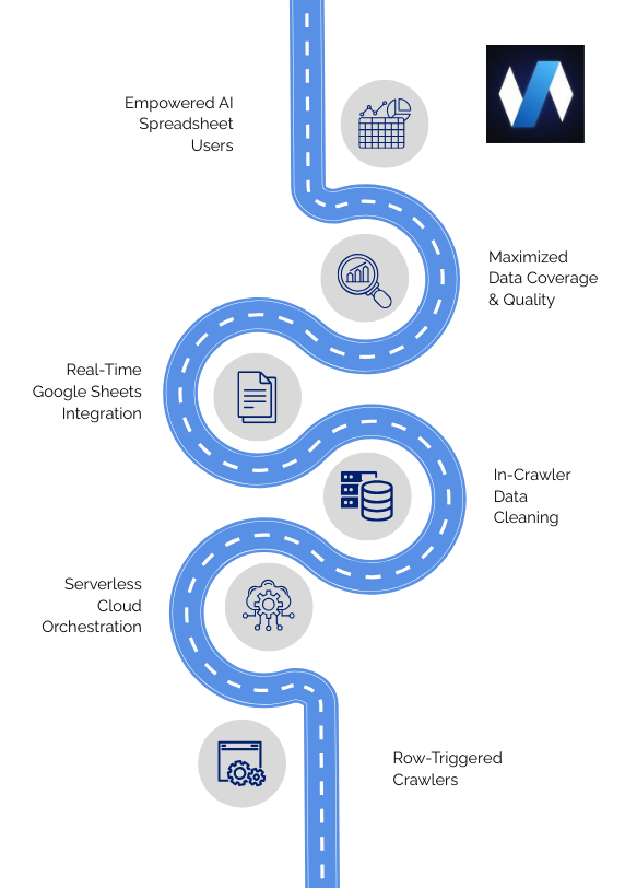 → Jyaba delivered a serverless, end-to-end pipeline that uses row-triggered crawlers (via Firebase/Pub/Sub) and in-crawler data cleaning within the Scrapy framework, ensuring maximized data coverage and instant sheet updates.